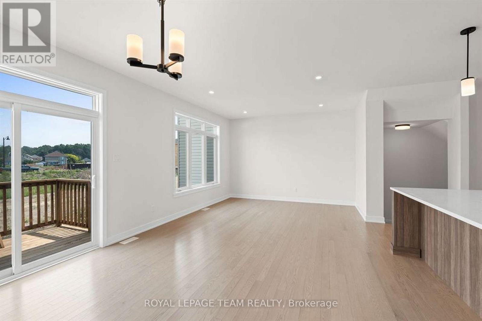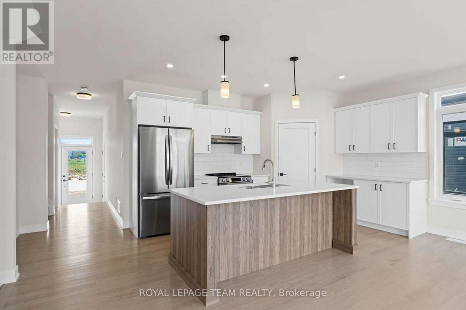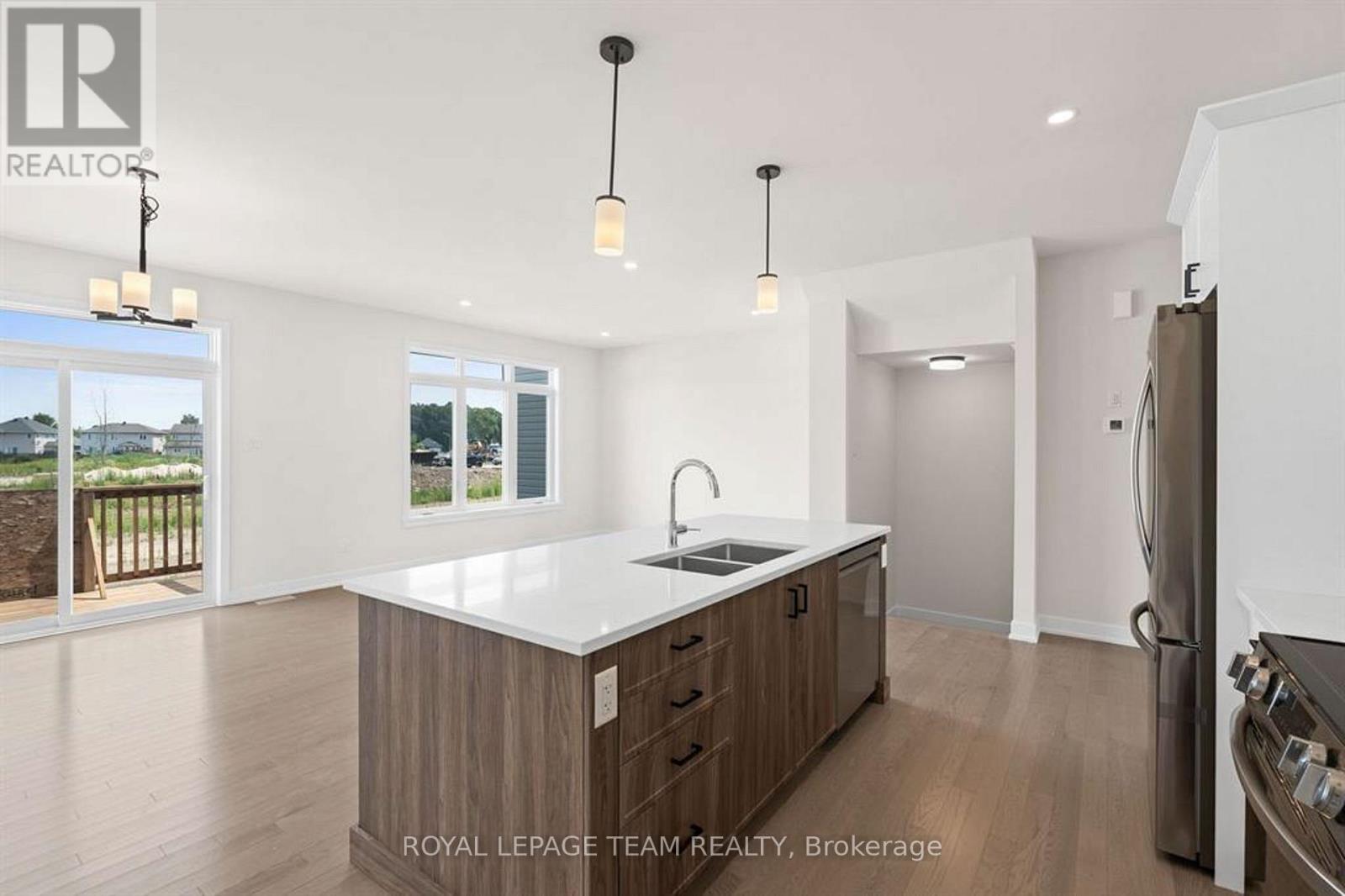 Discover this beautifully crafted semi-detached home in the sought-after Stirling Meadows community in Brockville. Available May 1, 2026, this newly built “Thornbury” model by Mackie Homes offers approximately 1,868 sq. ft. of thoughtfully designed living space, featuring 3 bedrooms, 3 bathrooms, and an oversized garage. The main floor welcomes you with a bright, open-concept layout designed for comfortable everyday living. The living and dining area features large windows, pot lighting, and hardwood flooring throughout, with direct access to the sun deck – perfect for relaxing or entertaining. The stylish kitchen blends form and function with quartz countertops, a subway tile backsplash, a centre island, a pantry, and stainless steel appliances. A convenient powder room completes the main level. Upstairs, the spacious primary suite includes a large walk-in closet and a 4-piece ensuite with a soaker tub and glass shower. Two additional bedrooms, a full bathroom, and a dedicated laundry room provide plenty of space and convenience for families or guests. Ideally located with quick access to Highway 401 and close to shopping, dining, and everyday amenities, this home offers the perfect balance of comfort, style, and convenience in one of Brockville’s newest communities. (id:13118)